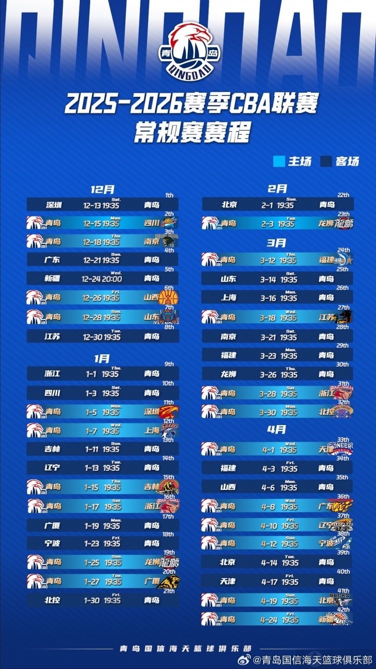 附上2025-26赛季CBA联赛青岛国信制药男篮常规赛赛程时间表: