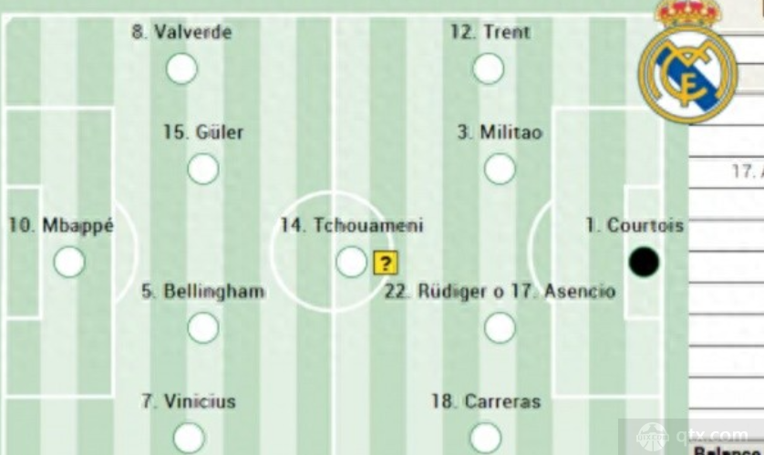在中场位置上,楚阿梅尼预计将会作为球队的单后腰,这名中场有着不错的防守与进攻能力,在近期的比赛中表现稳定,因此能够作为单后腰保证球队中场。而在其他几个位置上,居莱尔与贝林厄姆将会在中前场,这两名有着不错得分以及技术能力的球员将作为球队加强进攻的选择,保证球队的进攻。而在边路位置上,维尼修斯与巴尔韦德这两名球员将会坐镇,维尼修斯有着出色的速度与技术,巴尔韦德的速度也不错,两名球员将成为球队边路进攻的发起点。