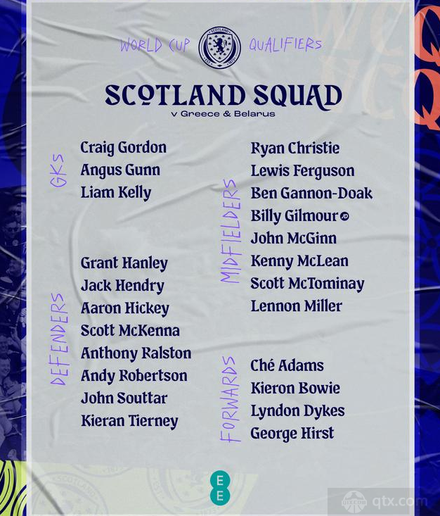 苏格兰10月世预赛名单 风笛军团迎来争夺榜首关键战