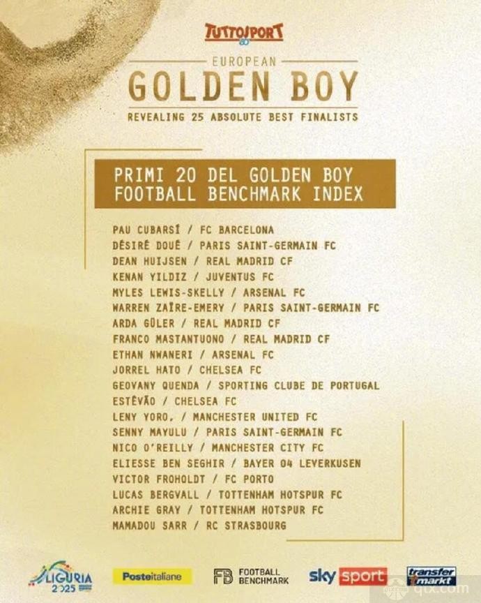 球天下10月16日 据《都灵体育报》消息,2025年欧洲金童奖公布25人候选名单。其中,常规候选名单20人,另有5人作为“外卡”入围。