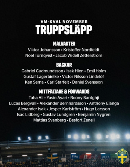 瑞典本次比赛的名单相比10月份的名单主要变化就是前锋位置,在11月份的世预赛球队主力哲凯赖什将因伤无缘,这名效力于阿森纳的前锋在近期表现不错,球员多次参与球队进球,在上周末的联赛也是帮助球队首开纪录,不过这名前锋在上半场比赛结束之后被换下,根据阿森纳官方的消息,哲凯赖什遭遇了肌肉伤病,球员预计在国际比赛日之后回归,因此瑞典也是没有征召这名球队主力前锋,而哲凯赖什的缺席对于瑞典的进攻将会有比较大的影响,此前外界都很期待本次国际比赛日他与伊萨克的配合,不过目前来看瑞典只能在锋线依靠伊萨克的发挥。不过,伊萨克在新赛季的表现也是比较低迷,球员近期才伤愈复出,回归之后能够有怎样的发挥还不可知,不过作为瑞典的核心球员,伊萨克也将全力帮助球队在11月份的世预赛有好的表现。另外,效力于纽卡斯尔联的埃兰加也将成为瑞典进攻的关键,这名有着出色速度的边锋球员能够给球队的进攻带来变化。另外,球队阵容也还有多名效力于五大联赛的球员入选。