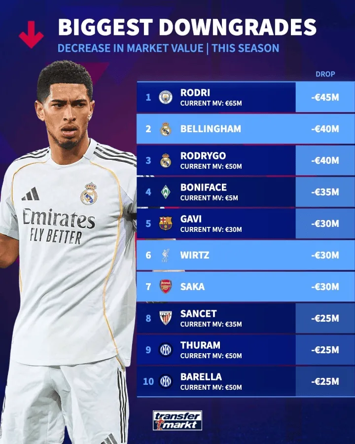 本赛季球员身价下跌排行榜 罗德里居首贝林厄姆次席
