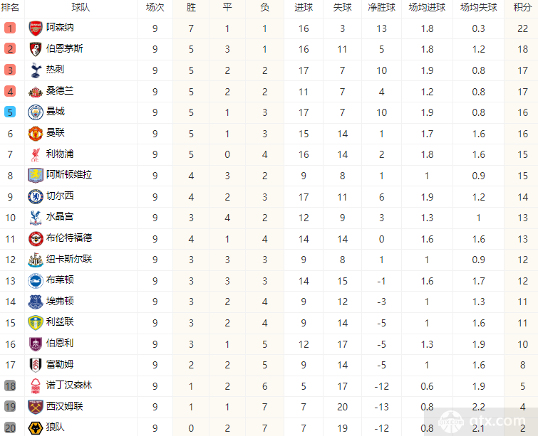 球天下10月27日讯 北京时间今日凌晨,英超联赛第9轮结束了全部比赛的交锋,在本轮比赛结束之后,阿森纳、曼联、热刺这几支豪门球队获得了胜利,而曼城、利物浦与切尔西则是输掉比赛,在目前的联赛积分榜上阿森纳继续保持榜首的位置,球队也是凭借本轮比赛的胜利扩大领先的优势,而曼城、曼联保持在上游位置,利物浦与切尔西的排名都有下降,热刺的排名则是获得提升。