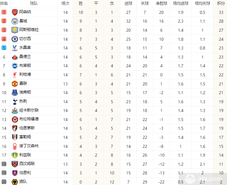 球天下12月4日讯 北京时间今日凌晨英超联赛第14轮继续进行多场比赛的交锋,目前本轮比赛除了曼联与西汉姆联的交锋还没有进行,其他比赛都已经结束。在本轮比赛中阿森纳、曼城这两支争冠球队都获得了胜利,热刺、利物浦与各自对手战平,切尔西则是输掉了比赛,近期表现出色的阿斯顿维拉则是继续取胜,球队排名上升至联赛前几名。