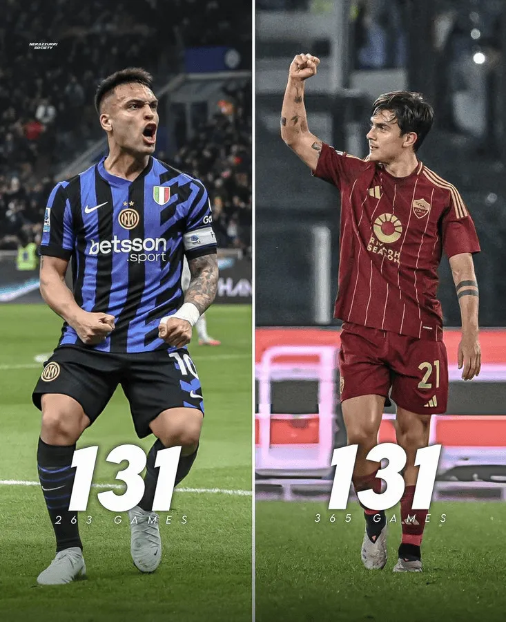 数据统计,劳塔罗目前在意甲打进了131个进球,从而追平迪巴拉,并列现役意甲进球最多的球员。不过,劳塔罗打进131球更加高效,他用了263场比赛,场均0.5球;而迪巴拉用了365场,场均0.36球。因此,劳塔罗超越迪巴拉,最快下一轮联赛即可实现。