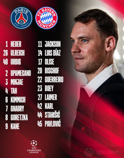 球天下11月4日讯 北京时间11月5日4:00,欧冠联赛第4轮将会进行一场比赛,拜仁慕尼黑将会在客场挑战巴黎圣日耳曼。两支球队都是欧洲的顶级豪门,在本赛季也有着出色的表现,因此这场比赛也是吸引关注。对于拜仁慕尼黑来说,球队将力争战胜对手延续本赛季欧冠的全胜战绩,不过客场挑战巴黎圣日耳曼球队也将面对挑战。在本场比赛开始之前,拜仁慕尼黑发布了球队本场比赛的名单。